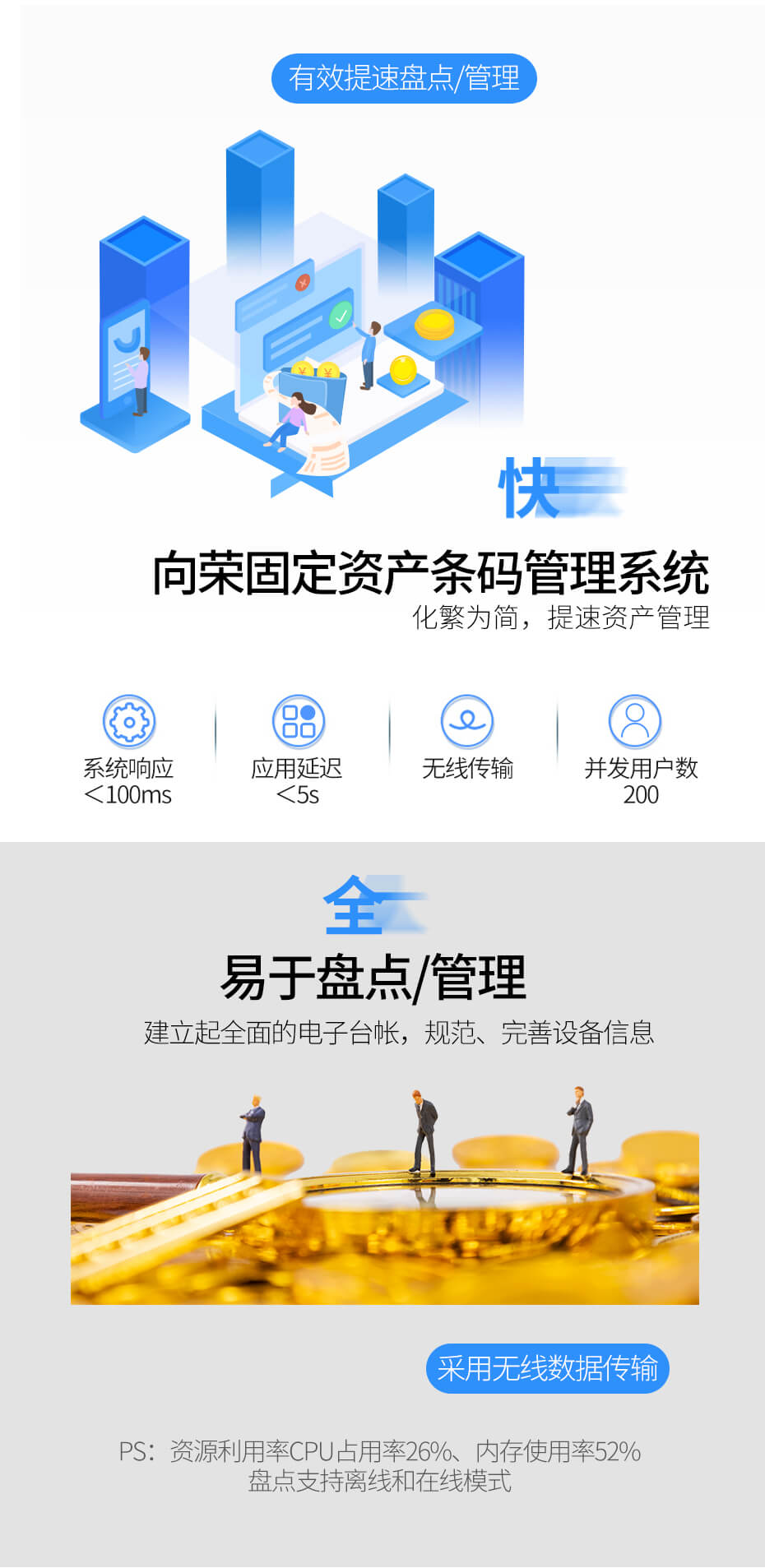 向榮固定資產條碼管理系統是一款根據資產分類對資產進行管理的軟件。該系統對每一件資產編制條形碼,是以實物管理為特點,以化繁為簡為目的的管理類軟件, 這是固定資產管理系統應用的基礎。 通過使用固定資產管理軟件,能有效提高固定資產實物實時狀態、盤點管理,實現以下目標: