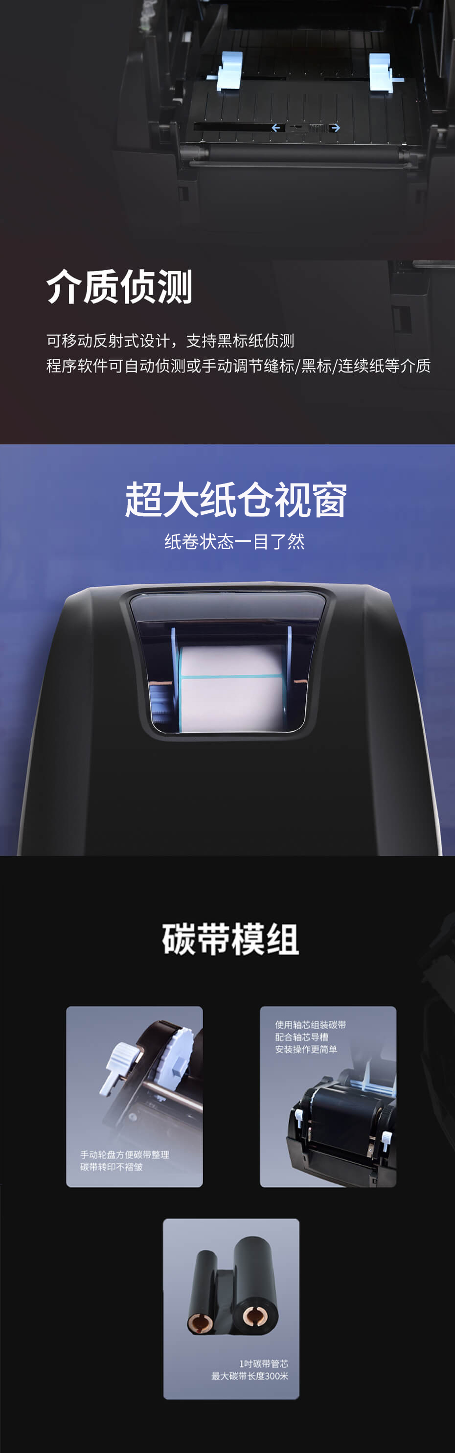 碳帶模組設計,使用軸芯組裝碳帶,配合軸芯導槽,安裝操作更簡單,手動輪盤方便碳帶整理,碳帶轉印不摺皺,1吋碳帶管芯,最大碳帶長度300米。